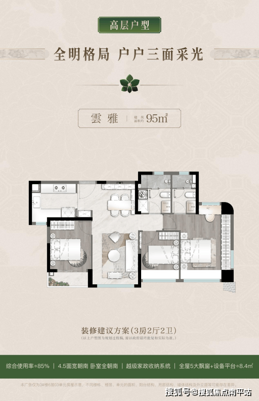 本次推出的 95㎡产品,在设计上突破了小户型的局限 —— 西侧单元直面海景,东侧单位远眺山景,真正实现 “开窗见景”。依托最新建筑规范与精装理念,得房率约 85%,95㎡的空间可享受约 110㎡的生活尺度,为改善型需求提供更高的居住舒适度