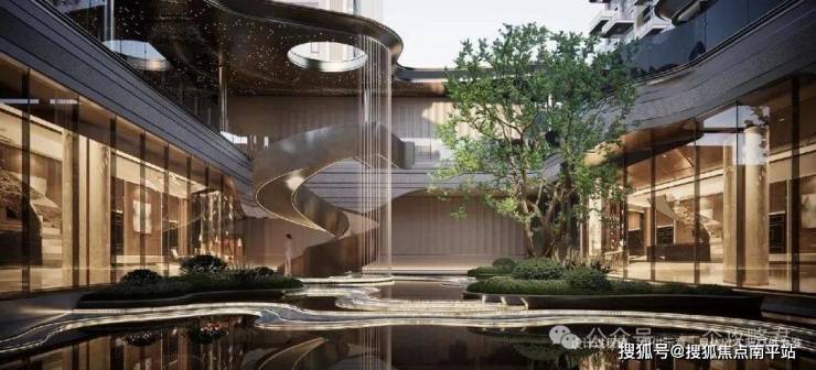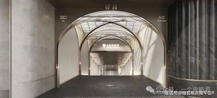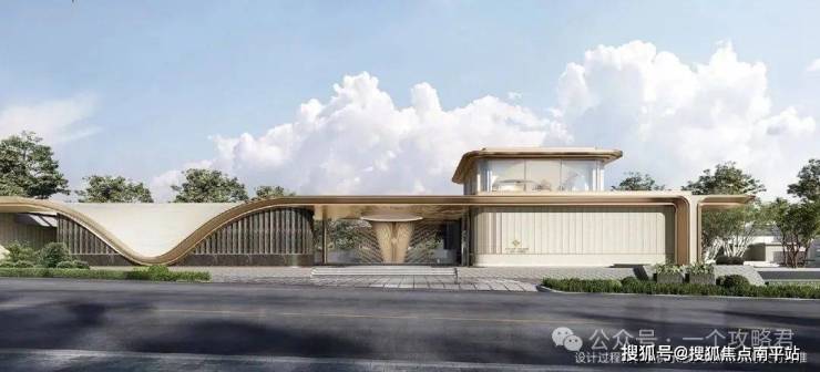 约67米长、约7.5米高漫享式奢雅门庭,整体设计采用流动金属线条。