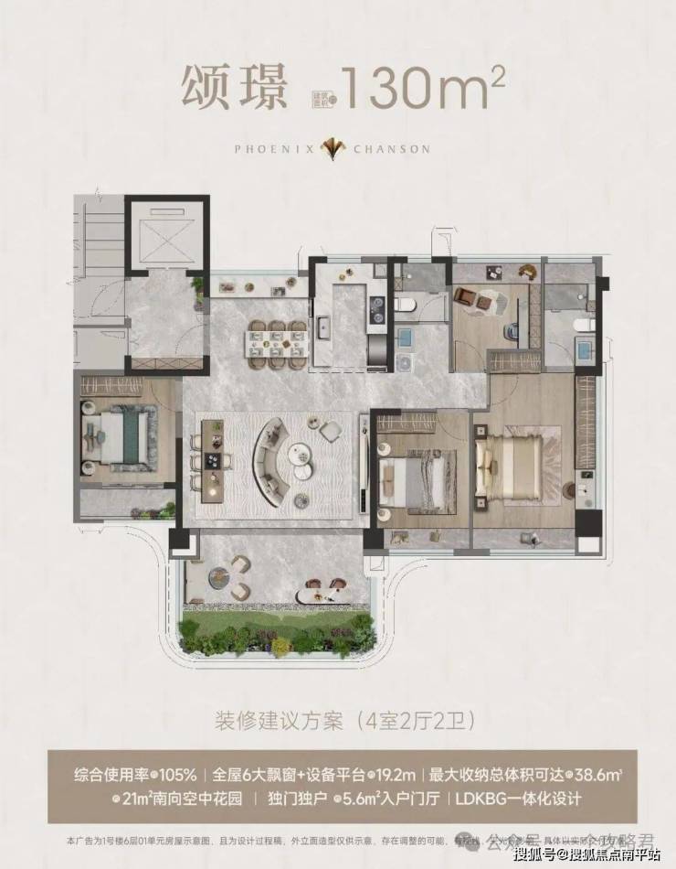 建筑面积约130㎡4房2卫,综合使用率高达105%!负公摊!独门独户,5.6平入户门厅;全屋6大飘窗+设备平台赠送约16.4㎡,最大收纳总体积可达约21㎡;22㎡南向空中花园。