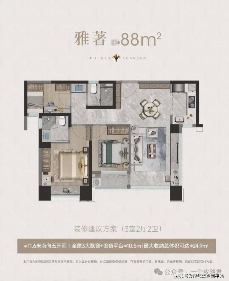 建筑面积约88㎡3房2卫,约11.6米南向五开间,全屋3大飘窗+设备平台赠送约9㎡。最大收纳总体积可达13㎡。