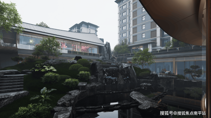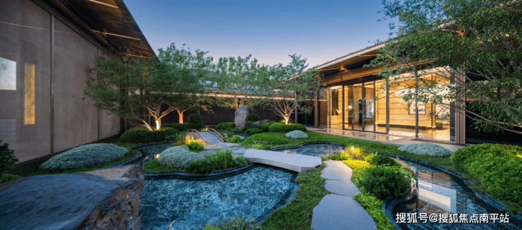 曲折蜿蜒的水系之上,小桥、石景搭配成一座“浮岛”,水景底部铺装的是源自意大利的普拉达绿奢石,就连业主容易忽视的角落,绿城也极尽投入。