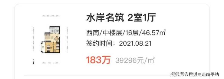 海沧体育中心——水岸名筑,46.57平2房,成交单价13743元/平,成交总价64万;2021年同户型成交单价39296元/平,成交总价183万;4年时间,总价调整了119万。