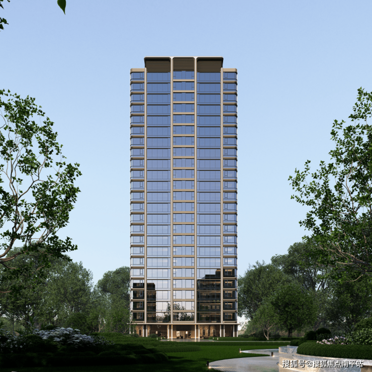 高层楼幢以大面玻璃+香槟金色铝板为立面主建材,金色线条从顶冠向下延伸,勾勒出建筑的挺拔轮廓。