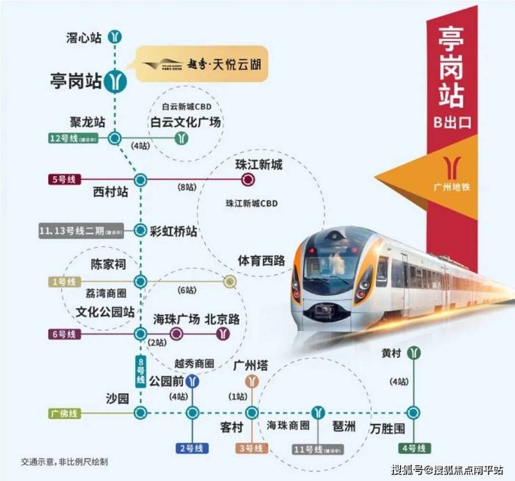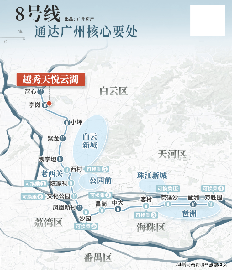 项目距离8号线亭岗站仅100米,8号线串起老荔湾、海珠西、客村、琶洲,是换乘之王,现状有8个换乘站,可以换乘多条地铁线,比如1-2-3号线以及广佛线