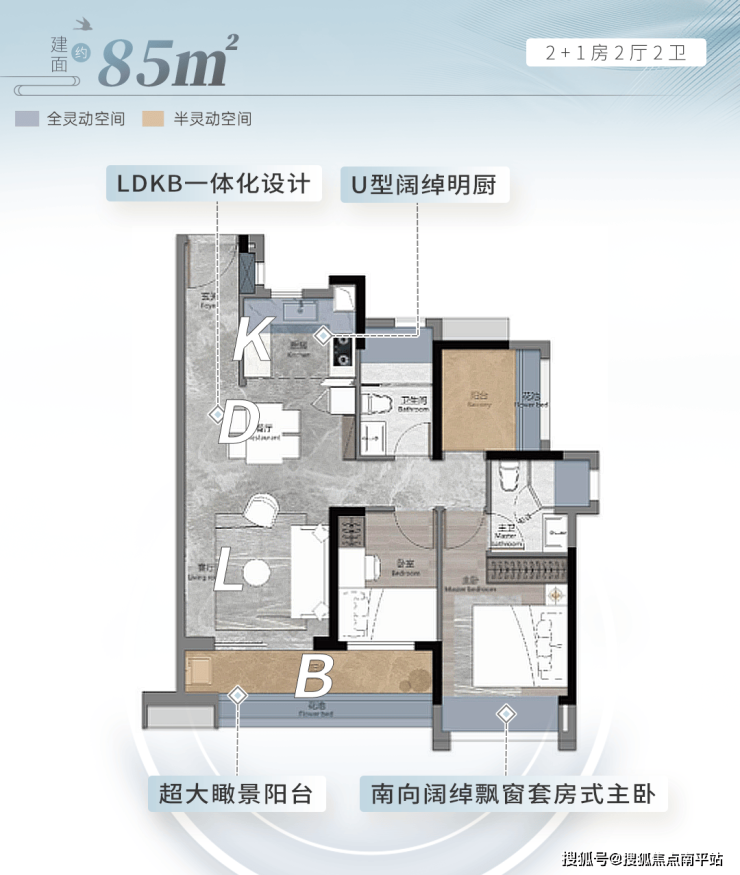 建面约85㎡2+1房,景观阳台尺度可与100㎡户型媲美,主卧配合X空间灵活调整,打通次卧作衣帽间/化妆间等,不成问题。建面约85㎡2+1房,景观阳台尺度可与100㎡户型媲美,主卧配合X空间灵活调整,打通次卧作衣帽间/化妆间等,不成问题。