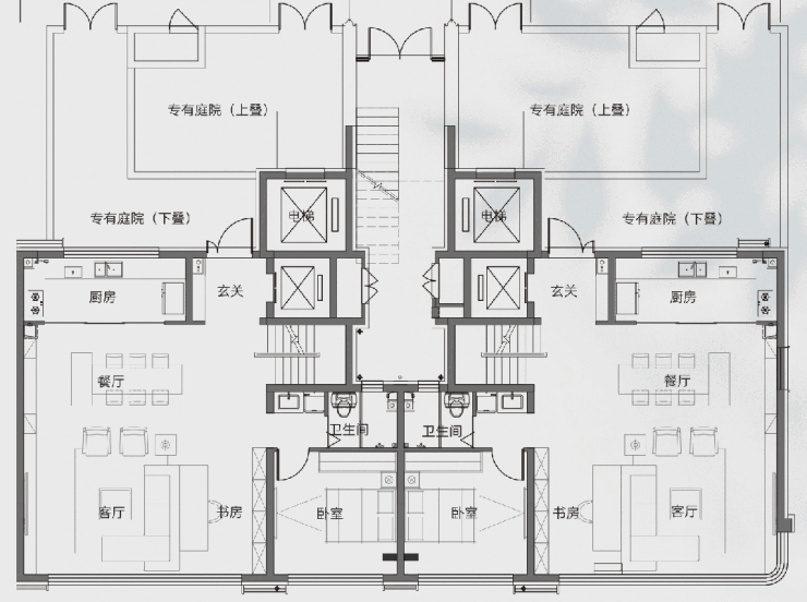 下叠业主在架空车库和首层地面则有自己的 独立归家动线,也不会和楼上邻居碰面。