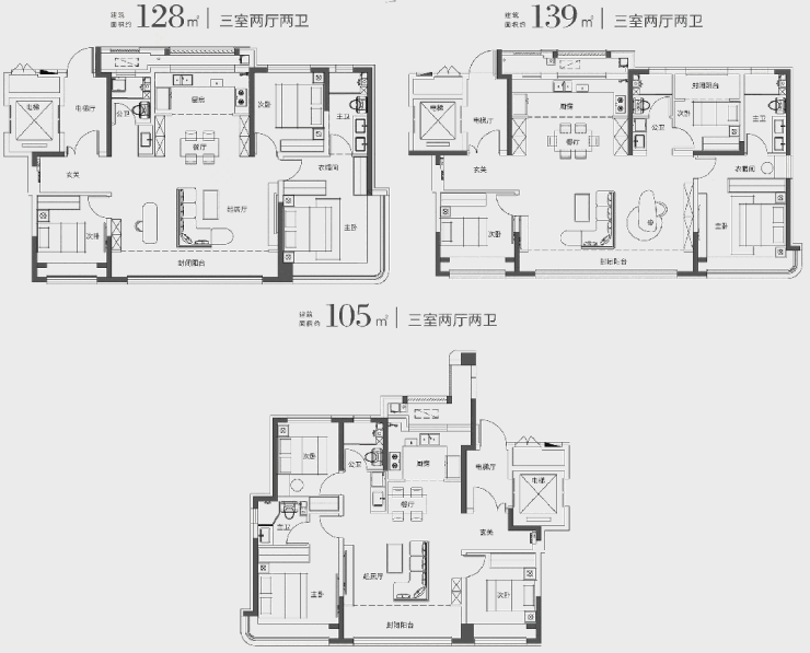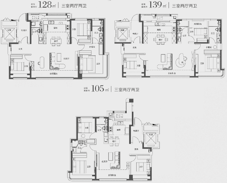 洋房户型共有三款:建筑面积 约105㎡、128㎡、139㎡三室两厅两卫。