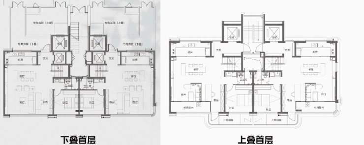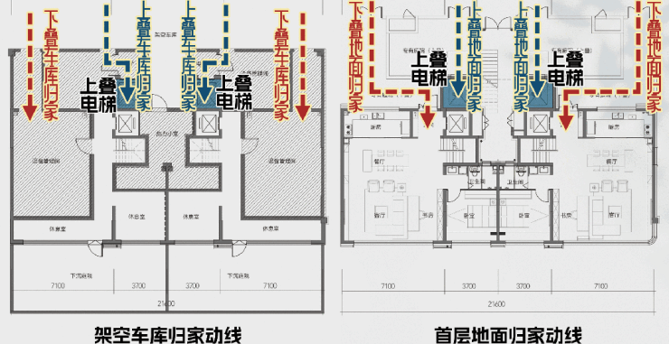 同时,上、下叠业主的 首层归家动线采取 并列设置,互不干扰。