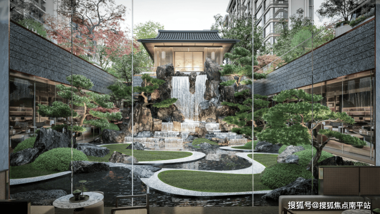 迎面的玻璃幕墙如同画框,背后下沉庭院的山水景致映入,恰似 仇英名画《高山流水》悬于墙面。