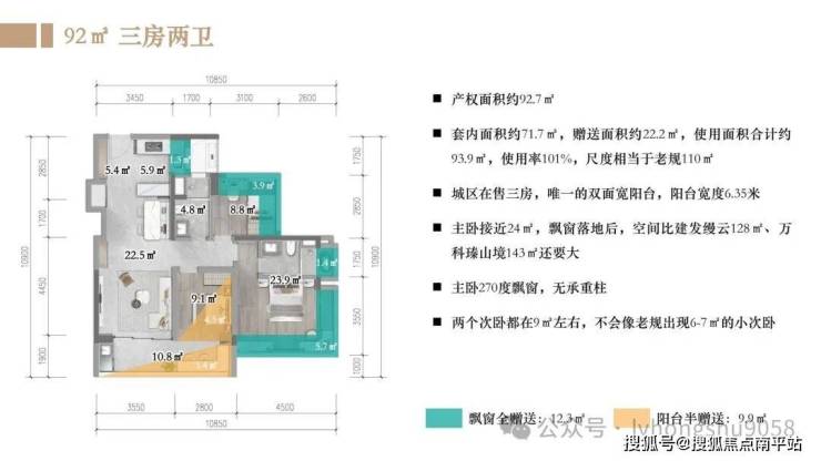 建面约92m²三房两厅两卫,使用率约100%