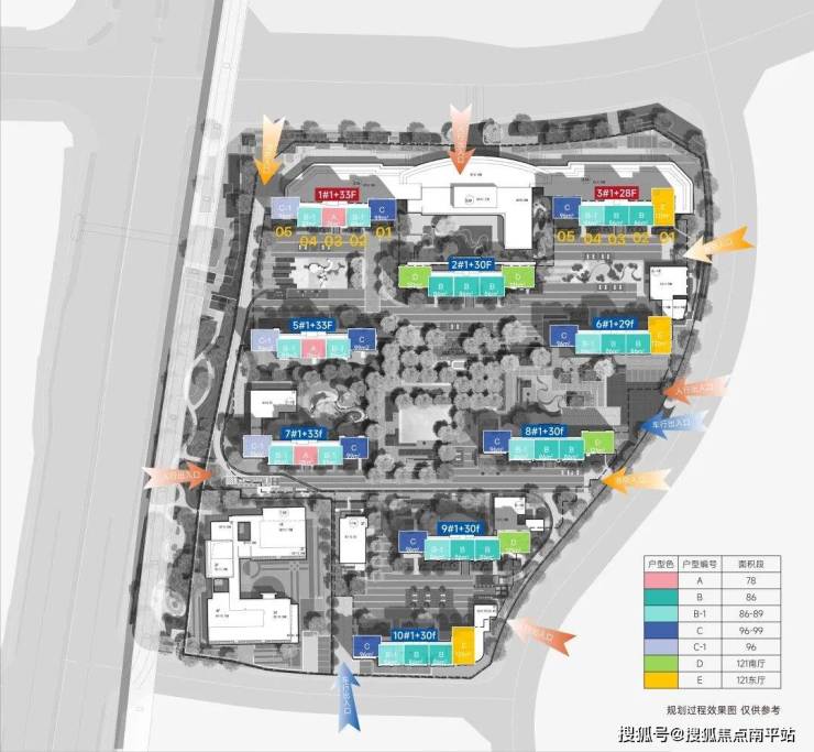 •绿化率: 36% ; •总户数:1380户;规划9栋29~34层超高层,2梯5户设计,楼间距:28~55米;车位:1426个;