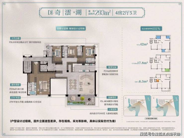- 建面约280-293㎡户型,同样位处头排瞰湖视野,纯T2布局,综合使用率约101%。南向约63㎡双层方厅与约9米宽空中庭院,将“景观私有化”推向极致。类独梯独户、约6.5㎡独立电梯厅,以及可与别墅媲美的全套卧独立卫浴系统,重新定义该面积段的空间高度。