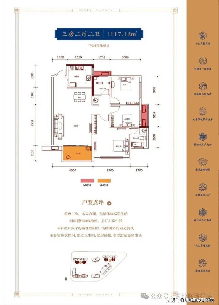 🏢 117㎡左右温馨三房雅致三房 ,布局合理,尽情体验高尚生活4米宽大客厅接景观阳台,接纳更多的阳光清风主卧配置齐全,起居便捷,尊享舒适私密生活