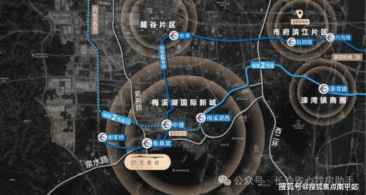 交通叠新:项目北侧接梅溪湖东西向主干道-泉水路,出门即地铁6号线象鼻窝站口,6号线横跨长沙东西直达黄花机场,一站即至花园城(在建),换乘2号线到五一广场/芙蓉广场等城市中心,畅游全长沙。