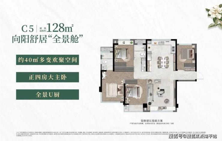 约40㎡欢聚厅堂,方正开阔,双窗采光。270°观景主卧配L形飘窗,全景U厨衔接餐厅,全明双卫设计,四房均好,打造三代同堂的温馨生活场域。