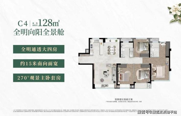 约15米南向面宽,全明通透大四房,270°观景主卧套房拥揽广角视野。独立生活阳台与社交U厨相连,互动便捷,空间利用率高,兼顾家庭互动与私密生活。