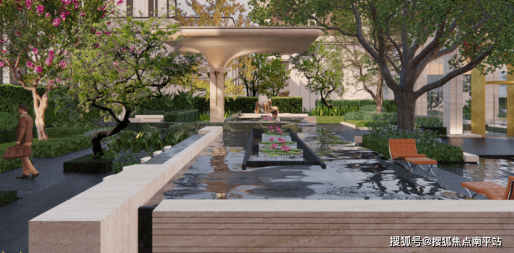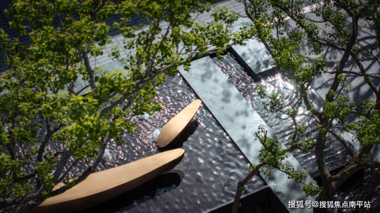 取法宋人"小中见大"的造园智慧,以现代语汇重构盆景意境: 苍劲松木与涌泉相映,乌桕、香樟、朴树背景林形成天然画屏,黄铜、大理石多种材质的永恒与松木的沧桑,在方寸间演绎时光二重奏。