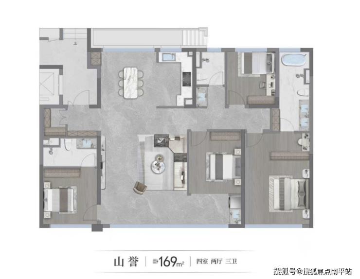 约169㎡户型,则实现了四面宽、宽厅、奢华主卧套、南向双套房的设计;这类产品的居住舒适度非常高,且产品保值增值能力强,毕竟不是每个地块都有如此低密的容积率和面宽优势,这也是楼王产品才有的居住尺度!