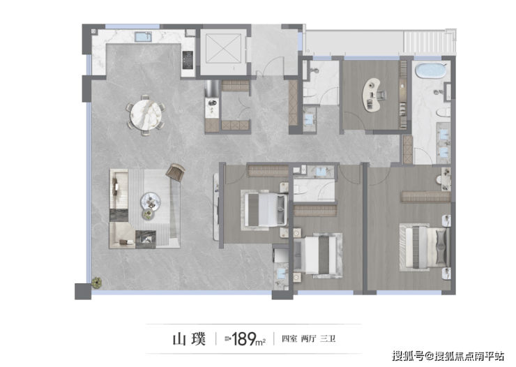 最后来看下边厅户型,约189㎡产品。独立电梯入户,超大宽厅、超大阳台的设计,动静分区合理;女王玄关、超大收纳,豪宅必备;南向双套房,奢华主卧套,墅级居住体验,这类产品还独有景观视野,堪称现阶段旅游路的孤品!
