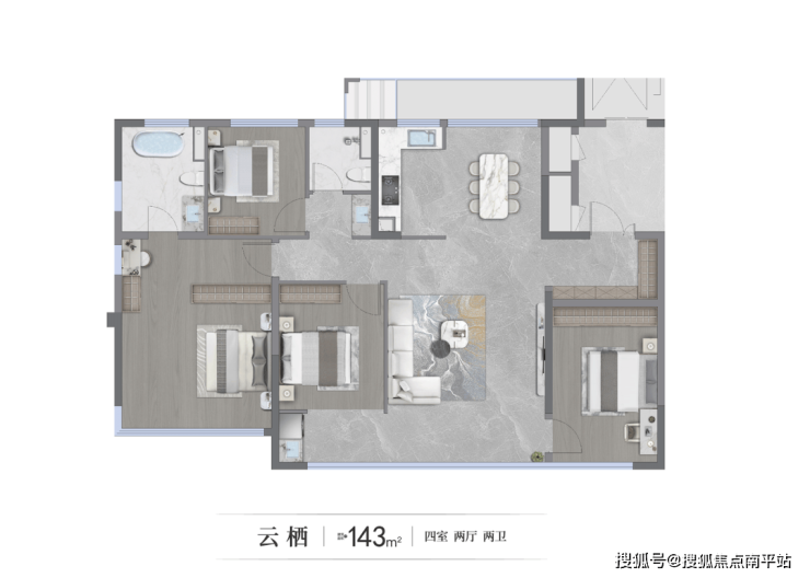 约143㎡户型,四房+宽厅的布局,彻底引爆济南楼市,尤其是全明通透、大主卧套房的设计,一个字:卷。