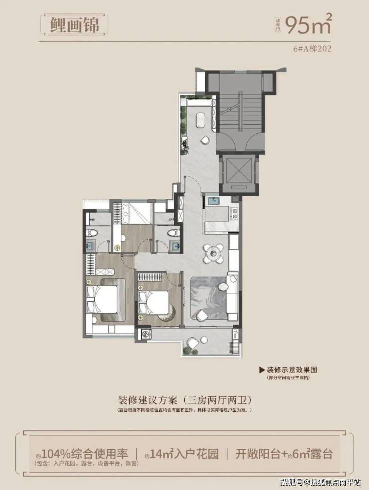 ★95㎡ 3房2厅2卫:入户花园、露台、实得约 100㎡;