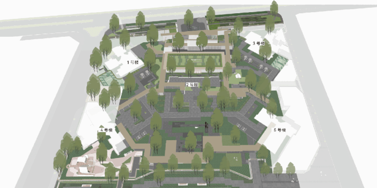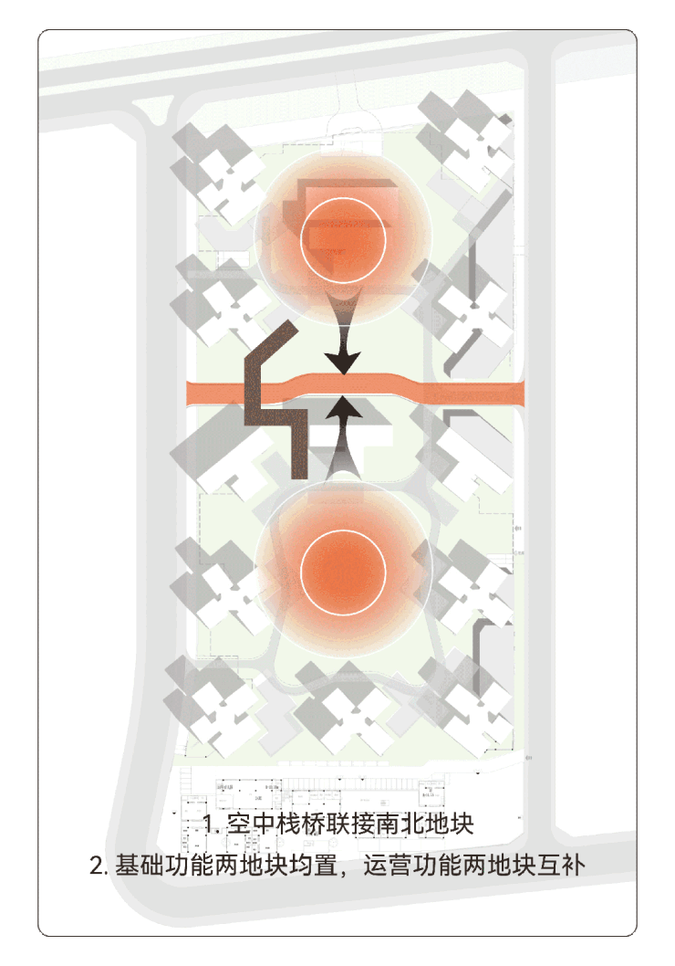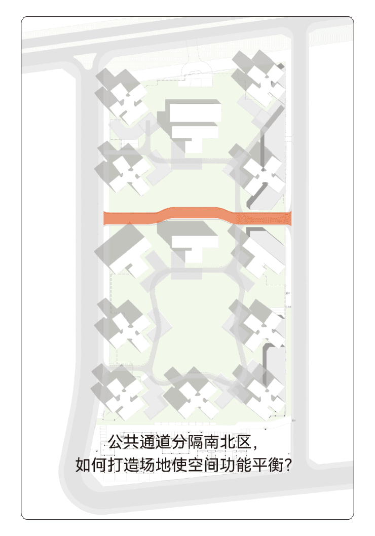 分析发现场地被24H公共通道分隔成南北两区,且东西向场地高差较大。此外,消防登高面的硬质铺装区域比例较大,且形态多元化,给予整体设计和功能布局带来一定的挑战。