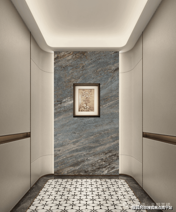 一进入户大门,就看到管家服务台,未来能提供钻石管家服务。拼花地砖、奢石背景墙、棕金框水波纹玻璃屏风,天鹅绒艺术漆吊顶与雕花电梯门, 对标五星级酒店式大堂。
