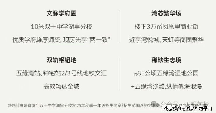 五缘公馆马路对面就是双十中学湖里分校,今年无论是区统考还是双十系联考都表现优异,未来可期的T1档优质学区! 五缘公馆作为准现房先享受“两一致”,以五缘湾最高性价比同时兼顾自住和教育的均衡!