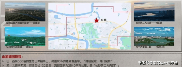 项目南临约1003亩月湖公园,西靠500亩生态山体麓峰山,北靠捞刀河风光带和苏托垸生态湿地,坐拥IMAX山景,远眺千米滨水河岸风光,超级绿肺举步即享,繁华都市里的静谧“桃花源”。