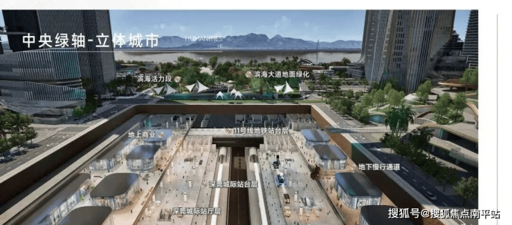 值得注意的是,项目南边的滨海大道一段长约1.56公里的道路“隐身”于地下,扩大了城市绿化与空间营造,地面连通深圳湾超级总部基地和深圳湾公园的上盖中央绿轴。