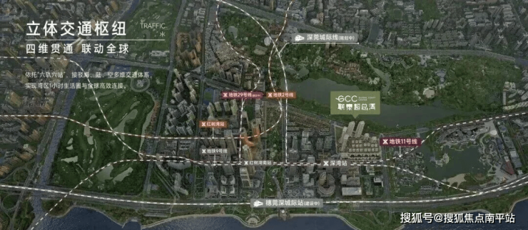 GCC联泰超总湾项目为地铁上盖物业,近距接驳2号线红树湾站与9号线深湾站。而深超总片区规划"六轨六站"立体交通网络,包括地铁2、9、11号线,规划中的29号线以及穗莞深、深莞城际轨道。