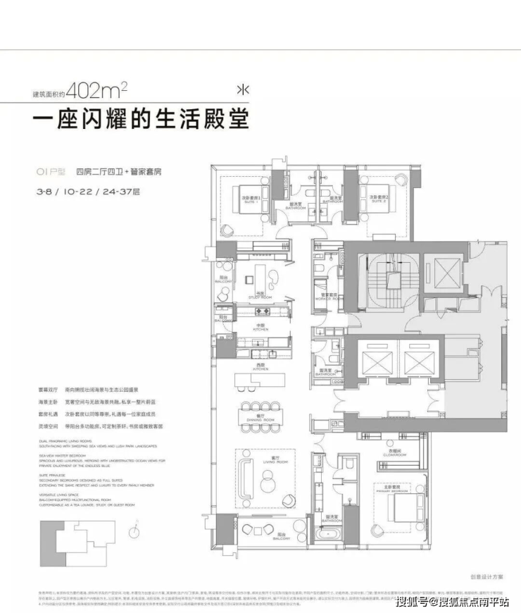 3栋低区3-37F,三面采光,客厅及主卧朝南看海,除了书房其它卧室全套房设计,该有的功能和尺度都给到了。缺点的话就是主卧整体尺度偏局促了一点。