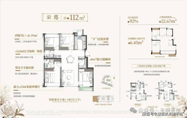 3、户型使用率高。我们在下节详细讲,通常市面高层得房率80%左右,前些年产品更是只有75%,那时82-89平仅能做2房、2+1房,102-113平仅能做3房,如今建发璞云凭借新规迭代+户型优化,户户约90%综合使用率,82-89平做到3房2卫,102-113平做到4房2卫,功能性和舒适性更强!