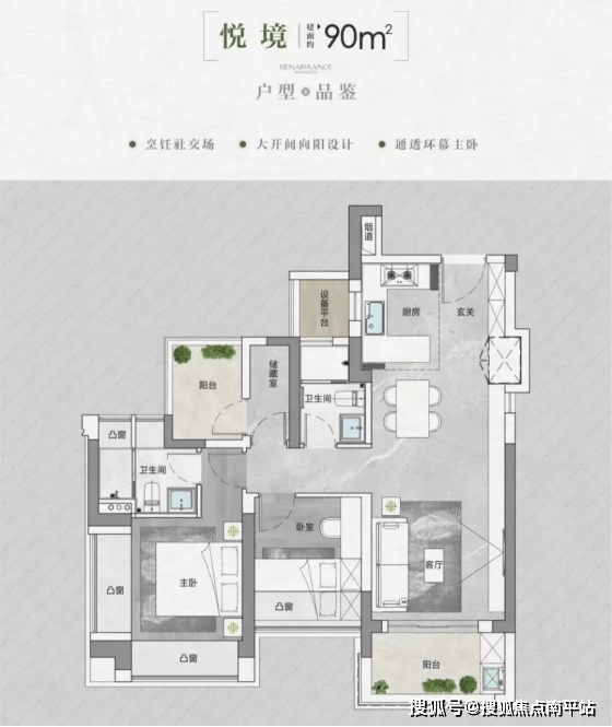 90 ㎡3房 单价:7.87-8.49万/ ㎡ , 总价:714-771万;