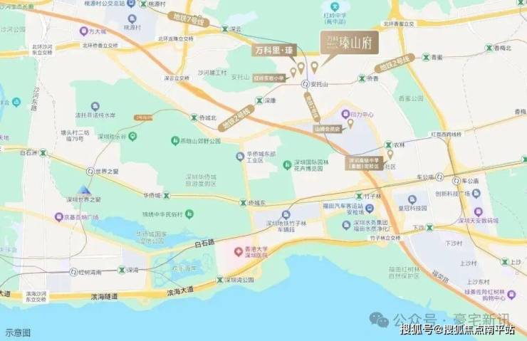 生态:两山一湖六公园环绕,包括安托山、塘朗山、香蜜湖及多个市政公园。