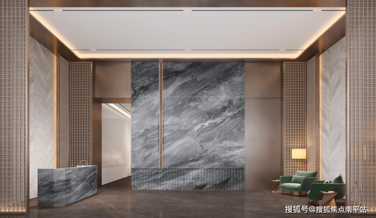 作为东莞南城标杆级人居作品,悦府在公区打造上突破传统豪宅范式,以“无界社交场域”为核心设计理念,通过材质迭代、空间再造、场景融合三大维度,将社区大堂、单元大堂、电梯轿厢、地下大堂及车库入口等高频使用空间,转化为承载身份认同与情感共鸣的载体。