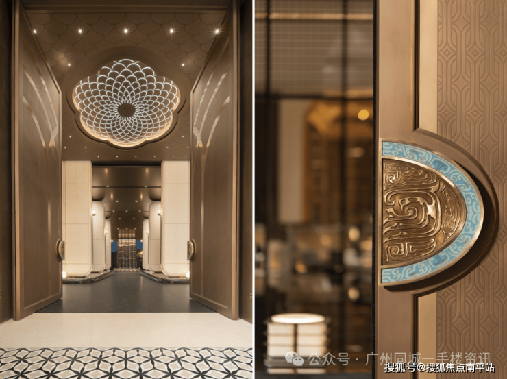 二进院“水境回廊”,将令人惊叹的“文化浓度”融于空间。六扇瑞兽纹墙以岭南剪纸工艺呈现,象征“六合天地”;两吨重约7.5米高鎏金铜门,由非遗大师朱炳仁锻造。
