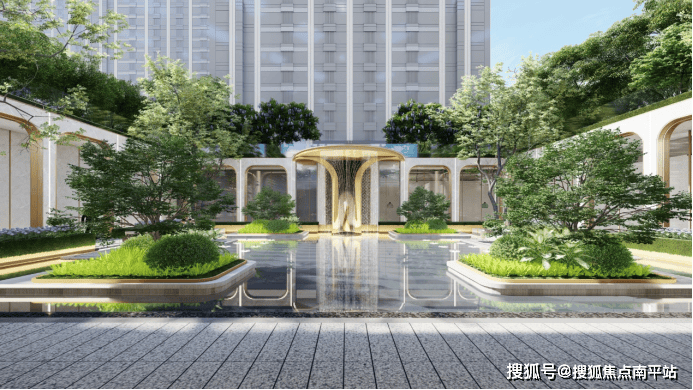 超过30米宽的大门,充满阵列感的古典形制与金属材质的现代奢华光影相结合,璀璨而震撼。光是这座大门的尺度,以及门前的双层叠水造景,就足以匹配甚至超越80%以上的上一代改善产品。