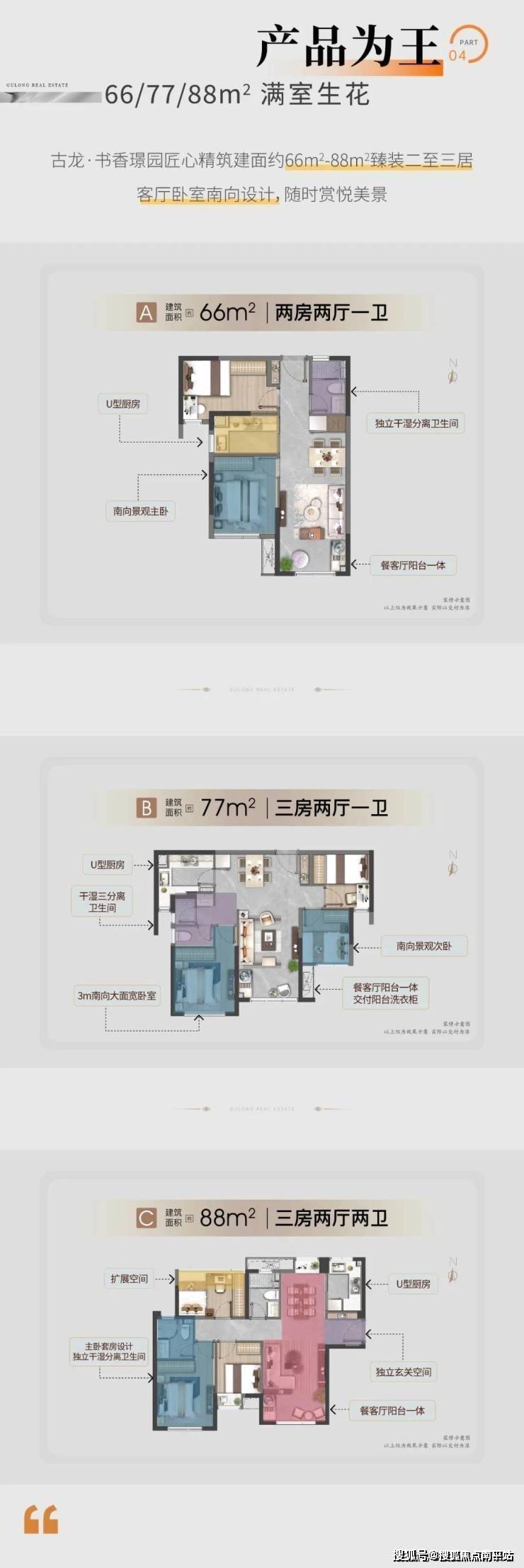 【户型】约66-88㎡紧凑舒适型二-三房,刚需首置首改产品,满足生活各种想象。