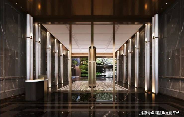 三重臻装入户门楼:地下门厅、首层门厅、私人电梯厅,一进一礼,敬呈归家至高礼序。