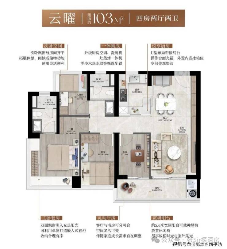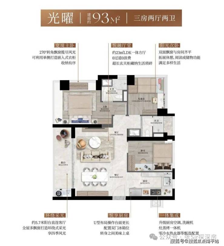 •同等户型更到位的功能实用性:全户型U型厨房布局,操作台面更长;双面齐平飘窗可打造嵌入式衣柜或休闲角,空间拓展性强。