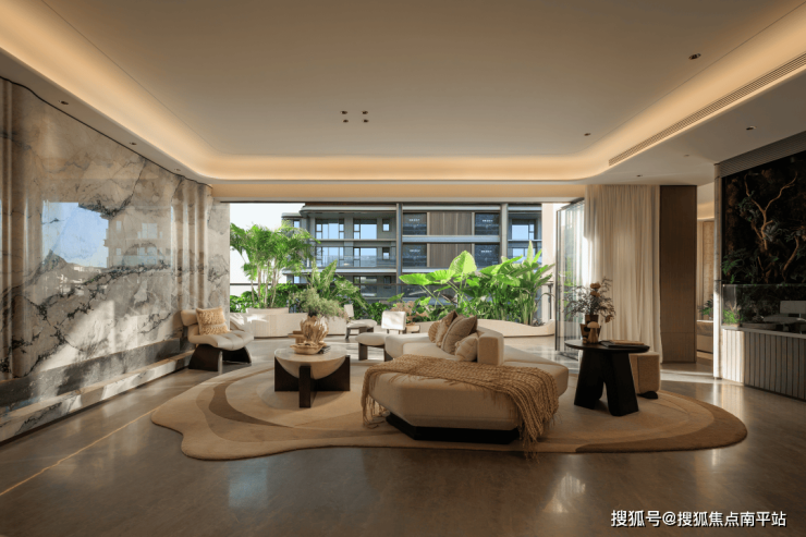 奇偶层通高露台采用南北翻转布局,将公区、客厅、卧室等功能空间有机串联,形成洄游动线,激发多重生活场景体验。南侧露台紧邻客厅,精装展示强调视觉通透与空间展示性;北侧露台连接多功能厅与厨房,精装则突出功能延展与场景氛围营造。