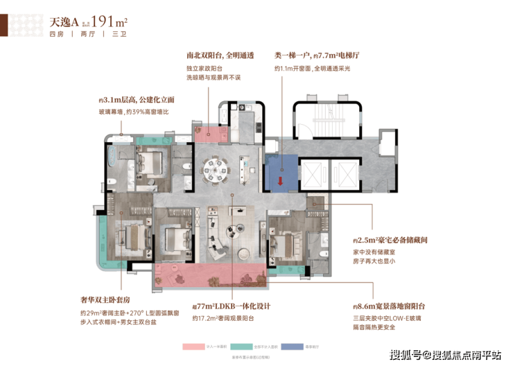· 两梯两户设计 , 类独立入户 ,赋予专属感和超强收纳功能; 创新双入户系统 ,提高便利性和私密性。