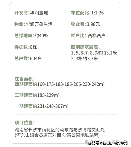 华润长沙瑞府四期楼盘了!该楼盘即将开售,位于长沙市雨花区沙湾公园地铁站旁,容积率2.9,共604户,由高层与超高层组成!共有6个户型分别为:建面约160、183、185、205、230、242㎡,得房率近100%以上。