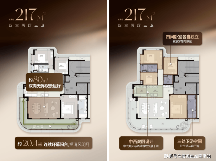 家族平层(建面约217-273㎡):以约10.8米南向超级横厅为核心,连接进深达2.4米的环幕阳台,形成IMAX级全景瞰海视野。空间布局充分考虑多代共居的需求,实现家庭成员亲密互动与独立私密的平衡,是传承与共融的家族主场。