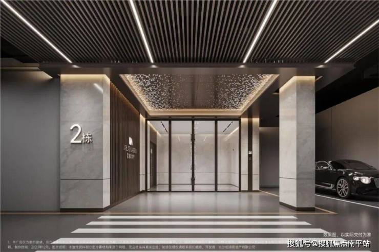 1.出入归家礼待:东入口社区大堂面积约120㎡,层高约5.5米(装修后约4.7米),墙面为瓷砖通铺,地面为石材微缝拼接,右侧通过大面岩板+天然云石壁灯渲染酒店式归家氛围;楼栋入户大堂采取电动对开门设计,层高约3.6米(装修后约3.1米),悬浮吊顶,墙面及地面通铺“简一(900*1800)”瓷砖,充分运用光影变化、艺术点缀、高贵建材等手法强化了精致的空间美学,匠著更契合业主的学府生活方式