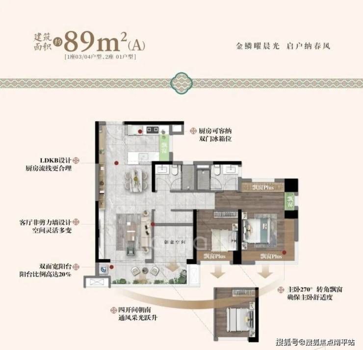 比如下方89平3房户型,做到了四开间朝南,主卧还能实现南北对流。