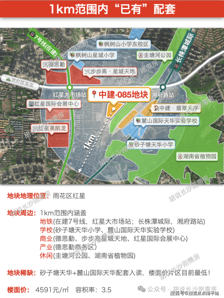 雨花区红星片区085地块,中建信和摘得,既去年5月摘得014地块开发中建翡翠天序后再次拿地,楼面价比中建翡翠天序(6901元/㎡)便宜2310元/㎡,容积率略高于中建翡翠天序(3.32),离7号线地铁站更近,离学校距离略远,种种迹象表明,似乎要背刺了;中建翡翠天序测评文章→中建翡翠天序 | 最好的留给了西地块