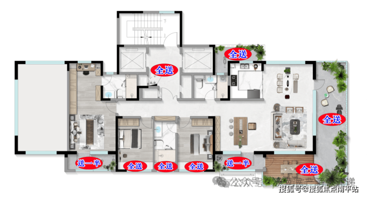 以200平为例,产证外的面积包含东西两端的花园及露台,南侧的阳台(算一半面积)及三个飘窗,北侧的阳台,电梯前厅。全算下来有超80平的赠送面积