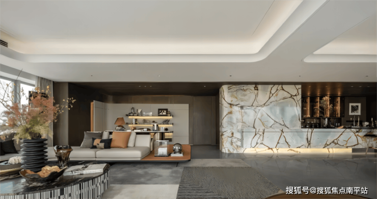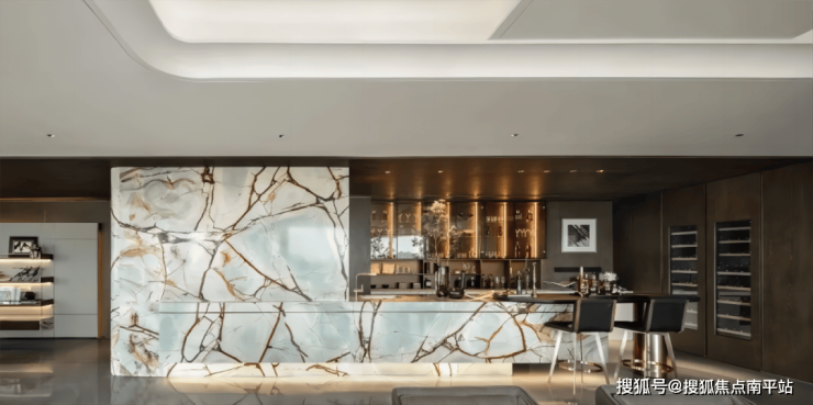 通过超长面宽的艺术奢石与深色木质结构的结合,将吧台与餐厅空间分隔开,形成相互呼应但不相互干扰的布局。温暖轻盈的光影映衬其中,展现出静雅的无限韵味。多功能吧台与中西厨料理区的结合,满足了空间的多元需求。